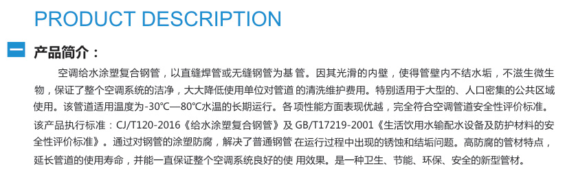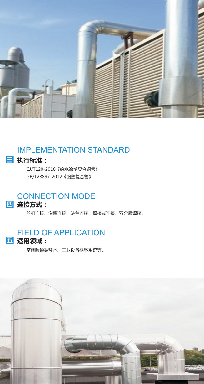 簡介:空調(diào)給水涂塑復(fù)合鋼管,以直縫焊管或無縫鋼管為基管。因其光滑的內(nèi)壁,使得管壁內(nèi)不結(jié)水垢,不滋生微生物,保證了整個空調(diào)系統(tǒng)的潔凈,大大降低使用單位對管道的清洗維護(hù)費用。